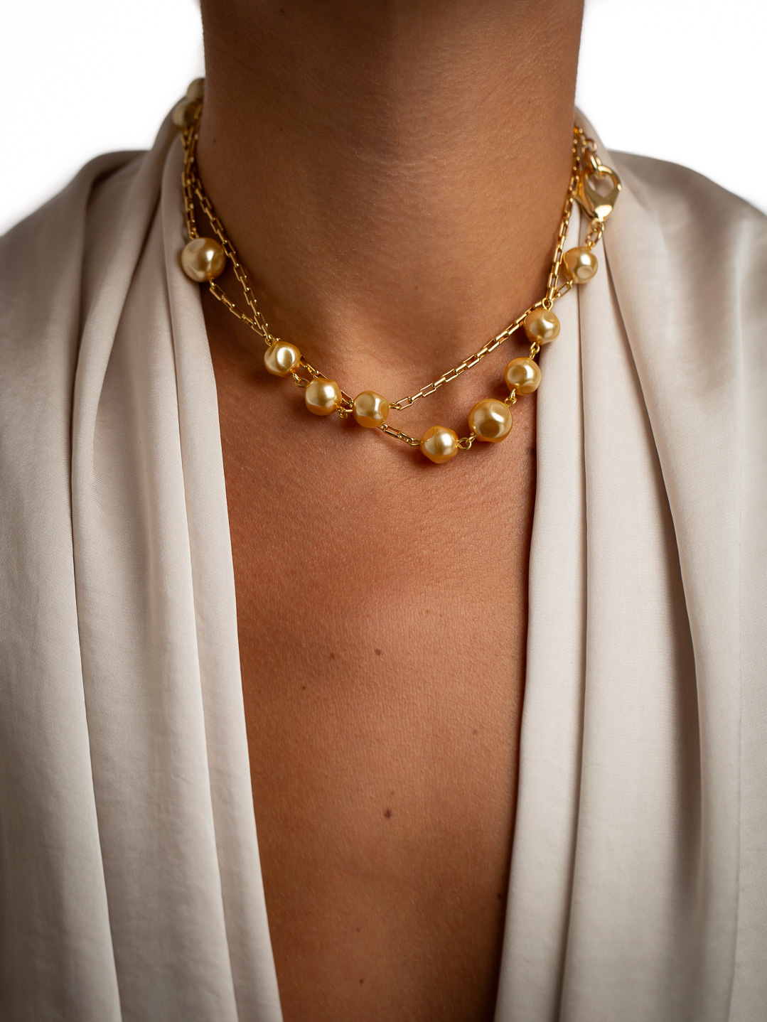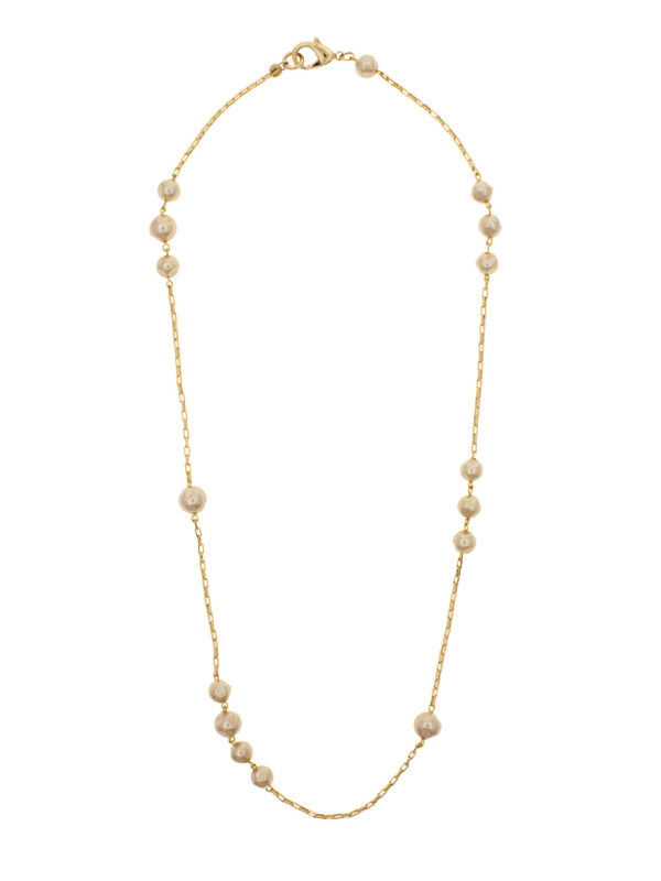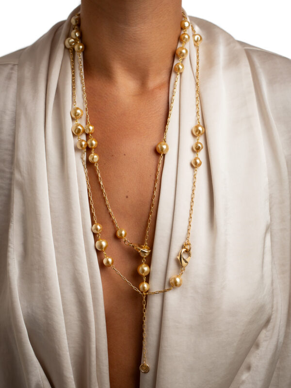 Collier sautoir de 75 cm composé de perles de verre irrégulières à l’effet nacré doré, associé à une maille dorée élégante.